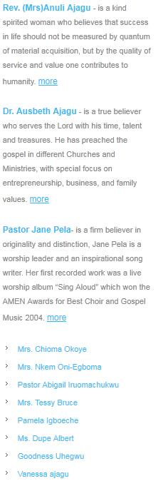 Films, Television and Radio outreaches Community based outreaches to the poor; the dejects and rejects of society Our Faith Our Manual Fundamental Scriptures Of Our Faith: John 14: 6 John 3:16 Romans 10:10: